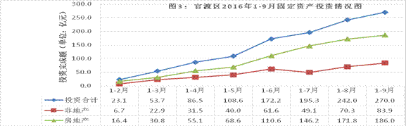 2016年1-9月份,官渡区固定资产投资269.99亿元,同比增长 4.3%,增速比1-8月下降1.5个百分点,低于全市7.5个百分点;从环比速度看,9月份固定资产投资负增长41.4%。房地产开发项目投资186.0亿元,同比增长74.8%,非房地产开发项目投资 83.94亿元,同比下降44.9%。三季度完成投资97.8亿元,同比增长14.7%,增速比二季度回落13.4个百分点,比一季度上升48.3个百分点(详见图1、图2)。商品房销售面积197.3万平方米,同比增长68.9%。