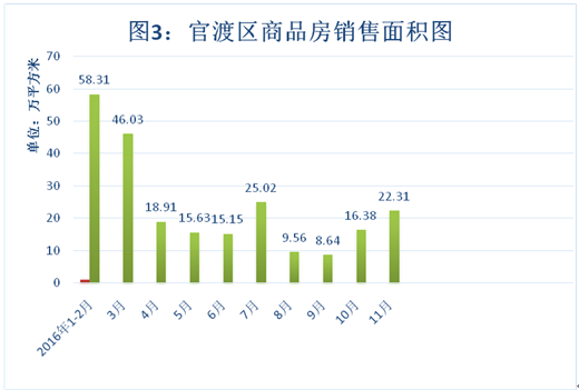 官渡区2016年商品房月均销售面积为21.45万平方米,11月商品房销售面积22.31万平方米,同比负增长28.4%,环比增长36.2%,详见图3。