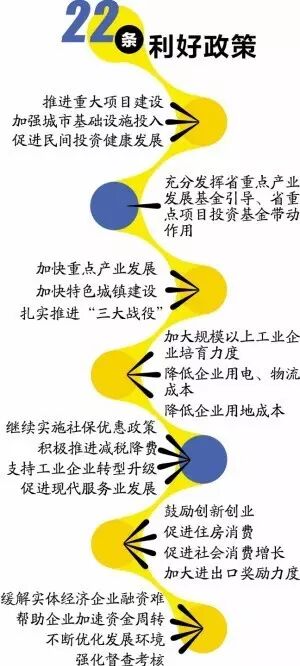 为深化供给侧结构性改革,有效应对经济下行压力,近日,省政府出台《关于进一步促进全省经济持续平稳发展22条措施的意见》(下称《意见》),从推进重大项目建设,加强城市基础设施投入,促进民间投资健康发展等22个方面,出台了一揽子利好政策,进一步促进全省经济持续平稳发展。