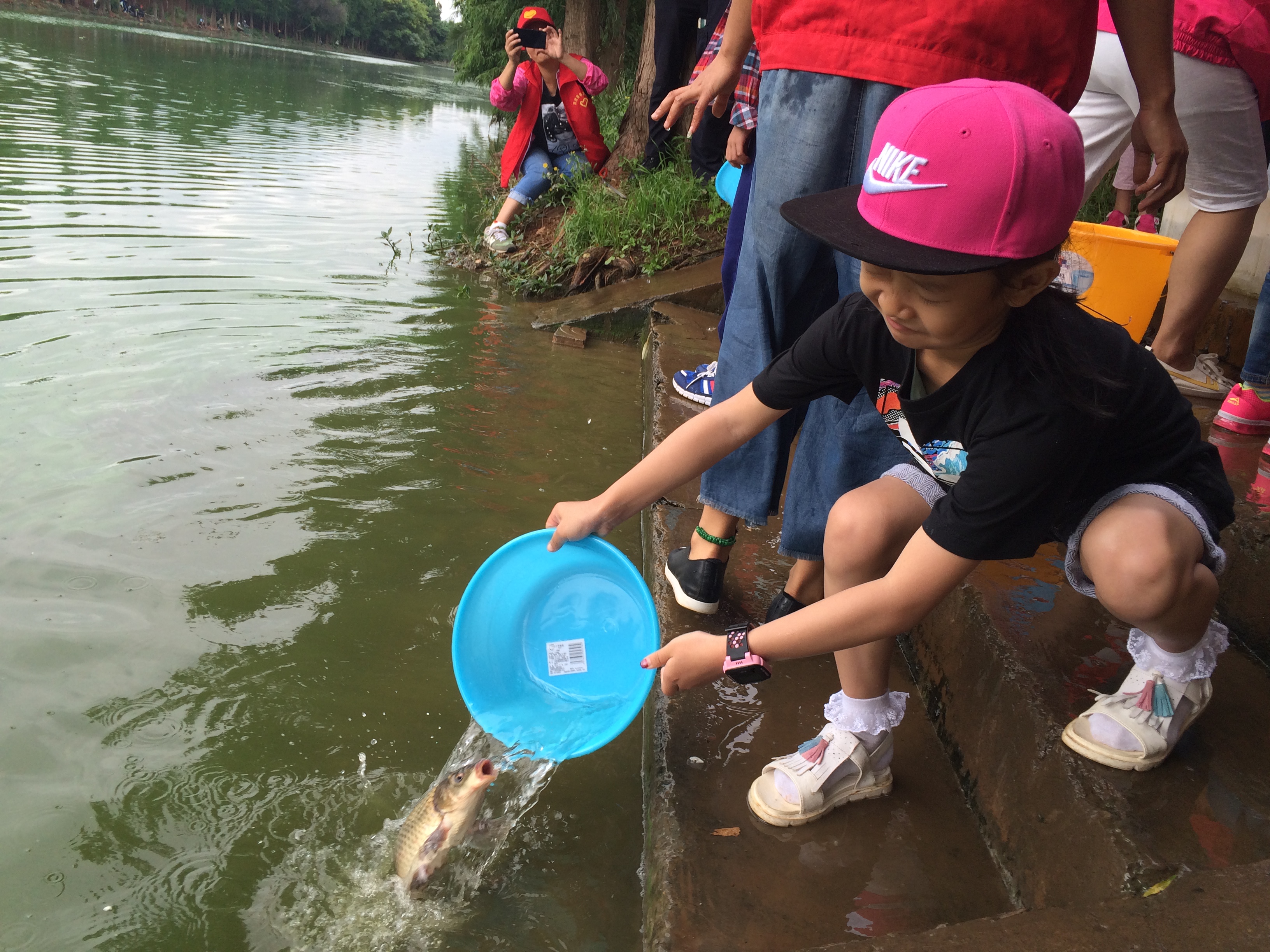 小朋友往河里投放鱼