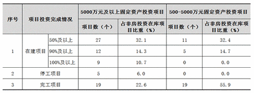 按项目行业类别来看,房地产开发投资项目70个,计划总投资2065.99亿元,累计完成投资1242.07亿元,投资完成率60.1%。非房地产开发投资项目118个,计划总投资809.91亿元,累计完成投资454.19亿元,投资完成率56.1%,其中:5000万以上项目84个,计划总投资803.28亿元,累计完成投资448.82亿元,投资完成率55.9%;500-5000万项目34个,计划总投资6.63亿元,累计完成投资5.37亿元,投资完成率80.9%。