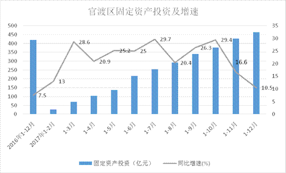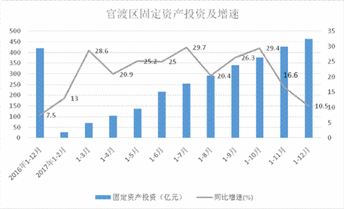 2017年官渡区(不含空港区、经开区,下同)固定资产投资(不含农户)完成463.39亿元,同比增长10.5%,高于昆明市2.9个百分点,同比增幅位居昆明市一板块第二名。