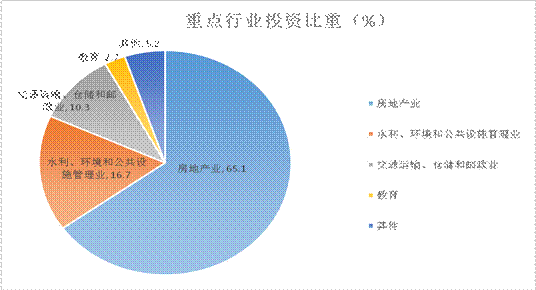 房地产业、水利、环境和公共设施管理业、交通运输、仓储和邮政业、教育投资分别完成301.78亿元、77.53亿元、47.77亿元、12.44亿元,同比增长分别为5.5%、22.1%、20.8%、77.8%,占全区投资的比重分别为65.1%、16.7%、10.3%、2.7%。