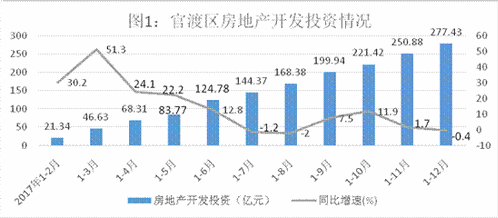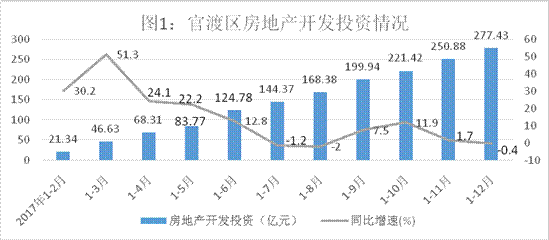 2017年官渡区(不含空港区、经开区,下同)房地产开发投资277.43亿元,同比下降0.4%,增速比三季度下降7.9个百分点,比1-11月下降2.1个百分点。