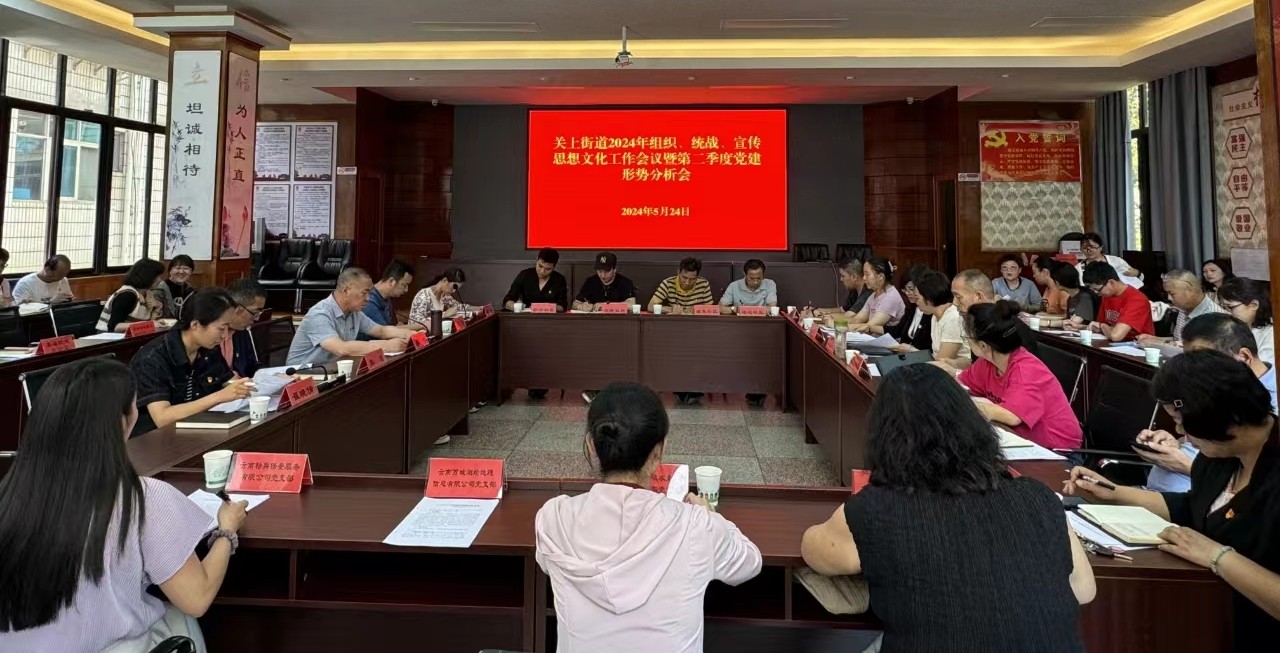 5月24日,关上街道党工委召开2024年组织、统战、宣传思想文化工作会议暨第二季度党建形势分析会。关上街道科级领导班子、各社区党委(党总支)书记、副书记以及街道各党建引领基层治理具体负责同志等60余人参会。