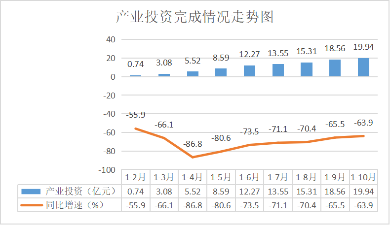 1-10月产业投资同比下降63.9%。虽然自今年以来产业均呈负增长态势,但自4月点(-86.8%)起我区产业投资企稳状态初显,截止4月增速最低点至今降幅已收窄23个百分点。