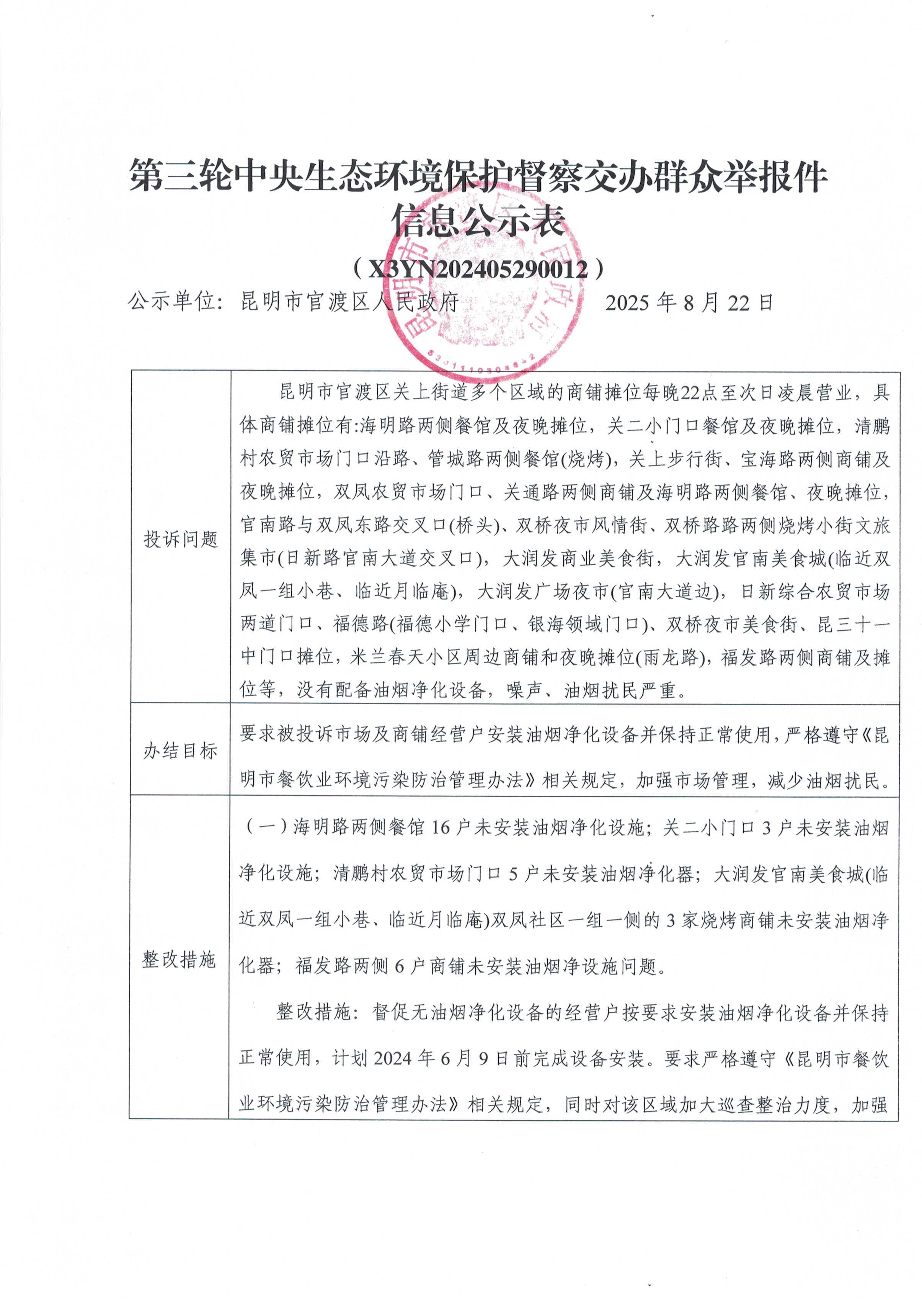 第三轮中央生态环境保护督察交办群众举报件信息公示表(X3YN202405290012)