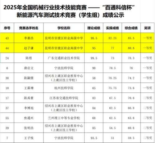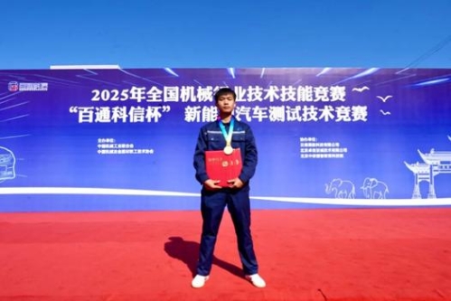近日,2025年全国机械行业技术技能竞赛“百通科信杯”新能源汽车测试技术竞赛圆满落幕。由昆明理工大学与昆明市官渡区职业高级中学联合培养的2024级首届“3+4”中本贯通新能源汽修专业学生李嘉浩、赵子谦,在全国29所职业院校61名顶尖选手中脱颖而出,双双荣获一等奖,并被授予全国机械工业“操作技术能手”称号。