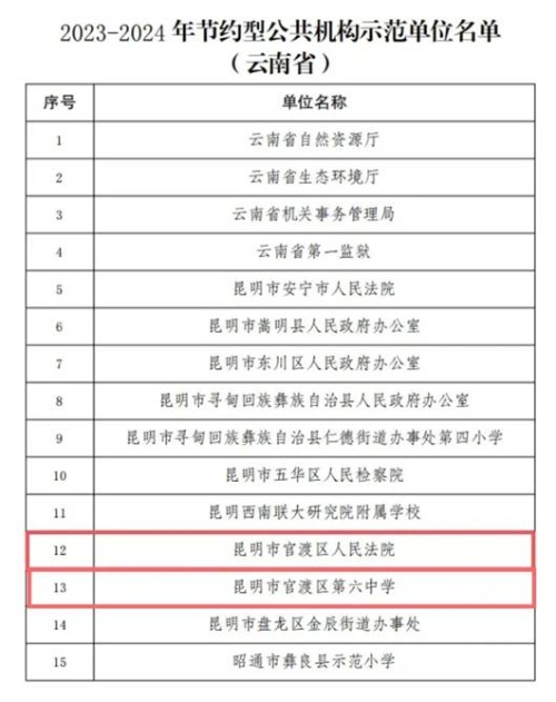 近日,国家机关事务管理局、国家发展和改革委员会、财政部联合发布《2023—2024年节约型公共机构示范单位暨能效领跑者名单》,官渡区人民法院与官渡区第六中学双双成功入选,荣获国家级“节约型公共机构示范单位”称号。这是官渡区持续推进绿色低碳发展、深化公共机构节能工作取得的又一重要成果。