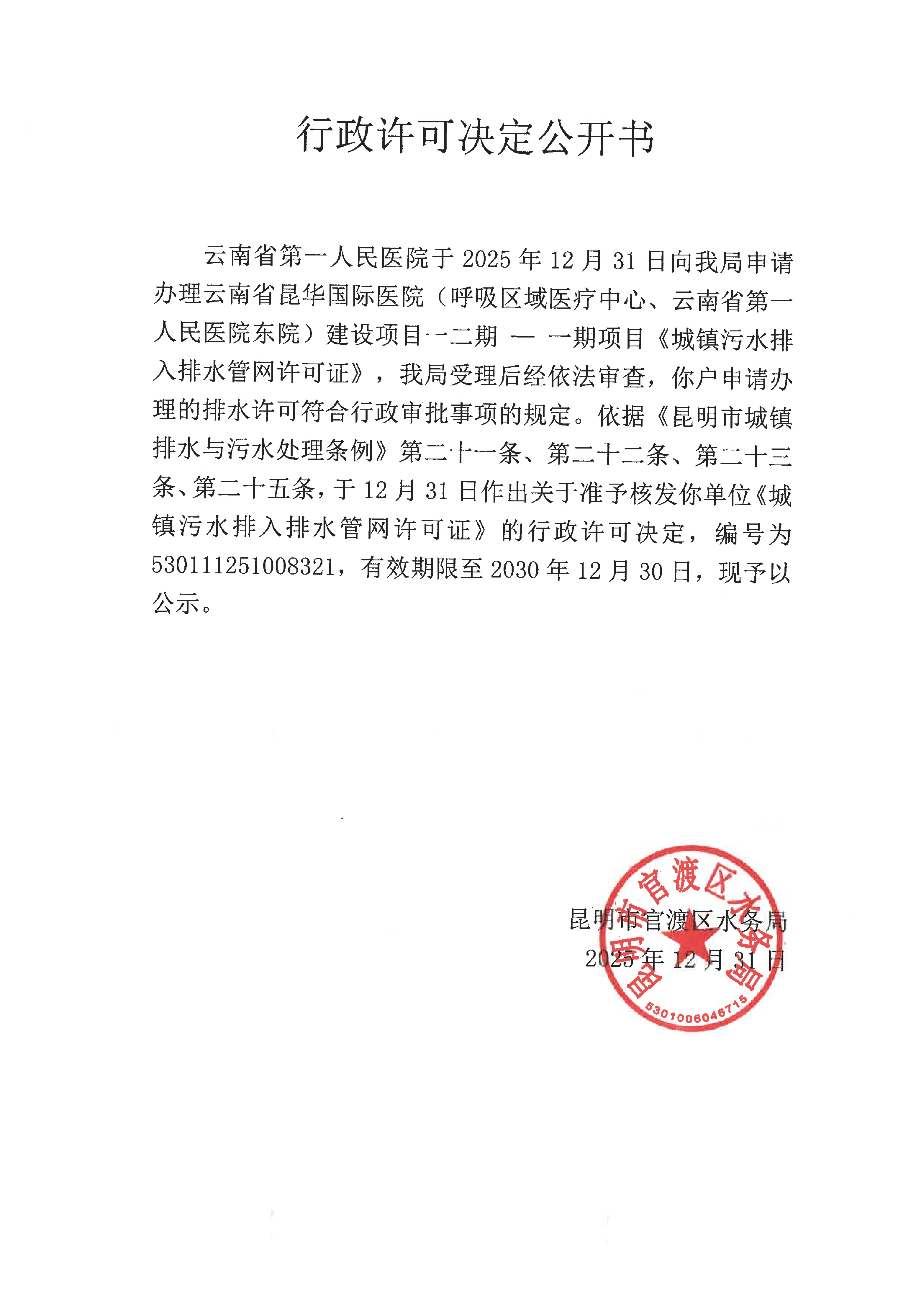 行政许可决定公开书(云南省昆华国际医院建设项目一二期-一期项目)《城镇污水排入排水管网许可证》