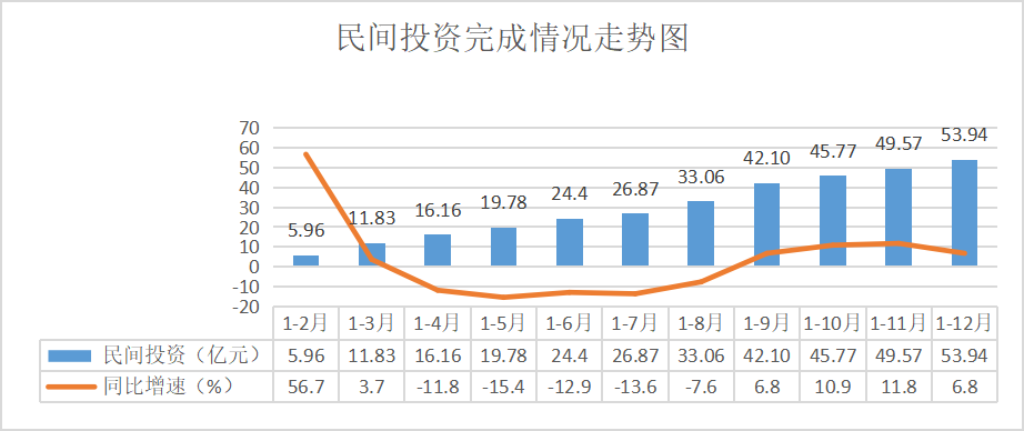 民间投资保持正增长。民间投资在库项目共计120个,占全部在库项目的35.6%。本年完成投资53.94亿元,同比增长6.8%。本年70个新入库项目中,民间投资项目22个,占全部新增入库项目的31.4%。