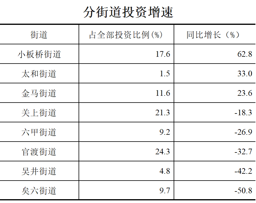 分街道看,3个街道同比增速保持正增长,分别是小板桥(62.8%)、太和(33.0%)、金马(23.6%)。回迁安置房及城中村改造项目是小板桥街道投资主要支撑。