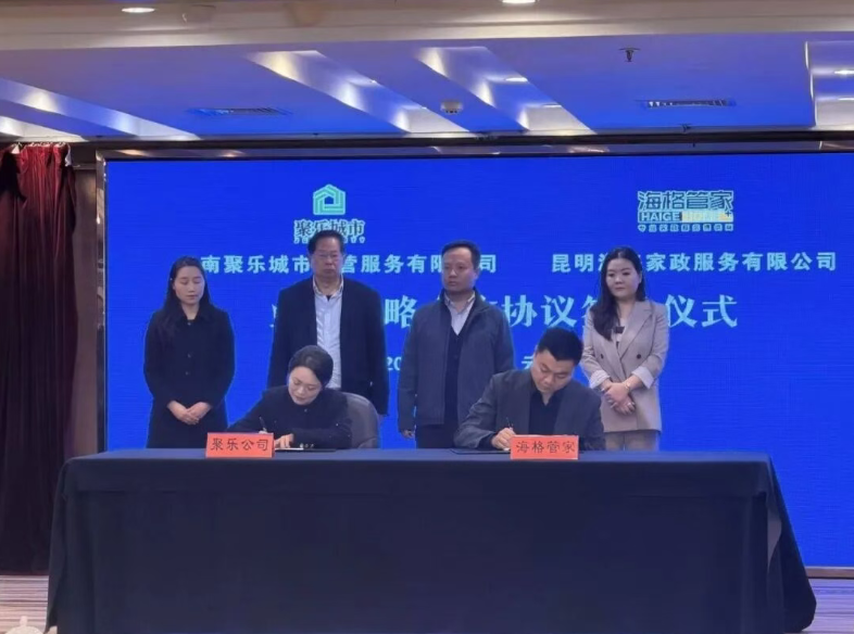 为推动公司向生活性服务行业市场化赛道转型,经昆明市官渡区国有资产投资经营有限公司(以下简称“区国投公司”)与昆明海格家政服务有限公司(以下简称“海格管家”)前期达成合作共识,2月3日,区国投公司下属的云南聚乐城市运营服务有限公司(简称“聚乐公司”)与海格管家正式签订业务战略合作协议,标志着双方在生活服务领域的深度合作全面启动。
