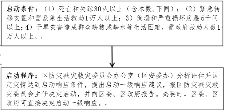 灾害发生后,区防灾减灾救灾委员会办公室(区安委办)分析评估并认定灾情达到启动响应条件,提出启动一级响应建议,报区防灾减灾救灾委员会主任决定启动,并向区委、区政府报告。必要时,区委、区政府可直接决定启动一级响应。