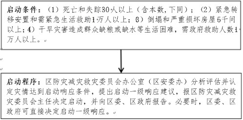 启动程序:区防灾减灾救灾委员会办公室(区安委办)分析评估认定灾情达到启动条件,提出启动二级响应建议,报区防灾减灾救灾委员会委常务副主任决定启动,并向区防灾减灾救灾委员会主任报告。 |