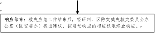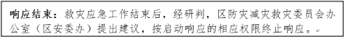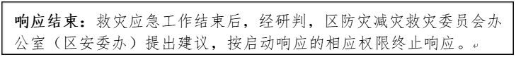 响应结束:救灾应急工作结束后,经研判,区防灾减灾救灾委员会办公室(区安委办)提出建议,按启动响应的相应权限终止响应。 |