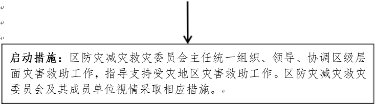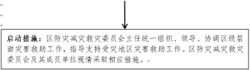 启动措施:区防灾减灾救灾委员会办公室(区安委办)组织协调区级层面灾害救助工作,指导支持受灾地区灾害救助工作。区防灾减灾救灾委员会及其成员单位视情采取相应措施。 |