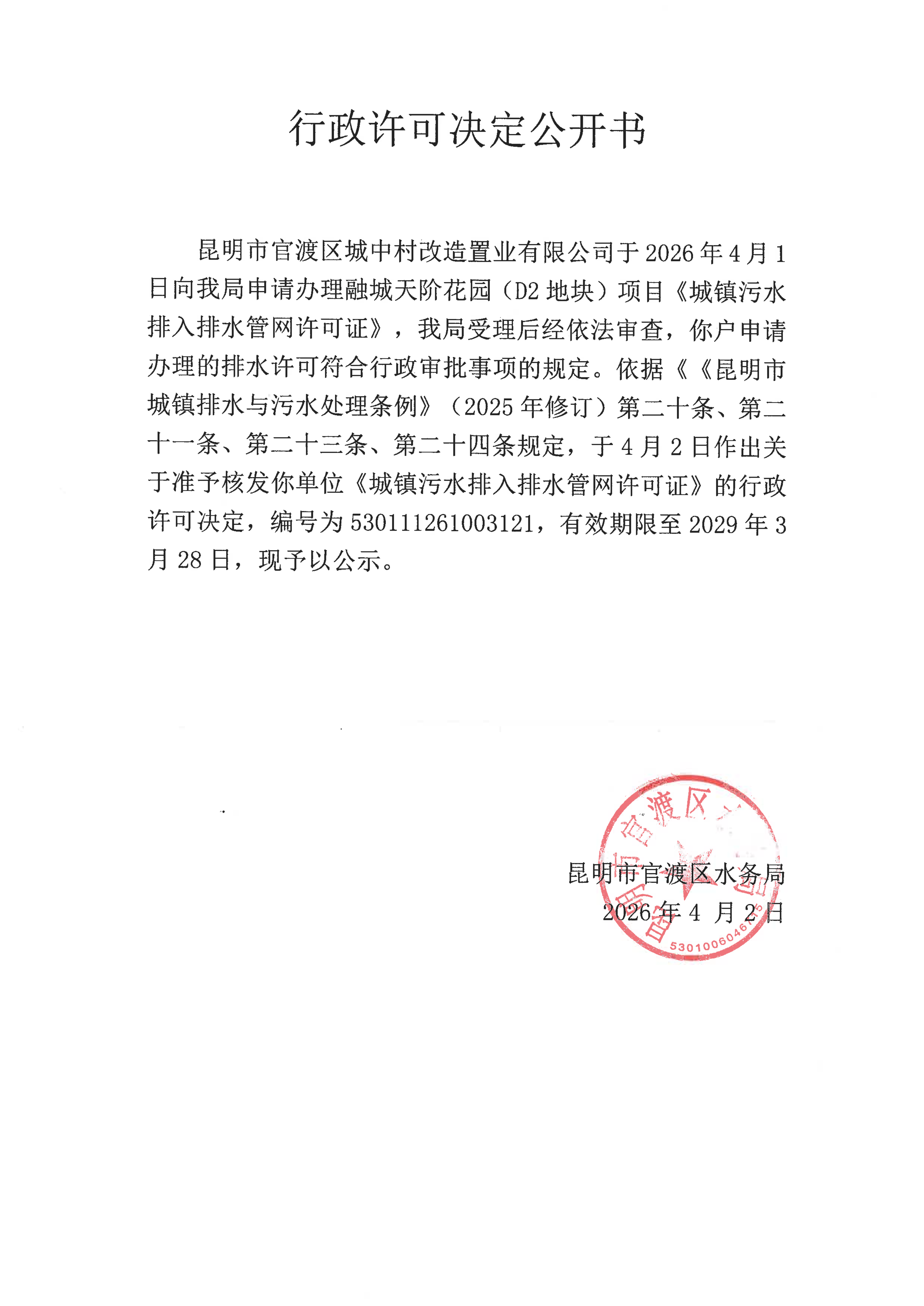 行政许可公开决定书_理融城天阶花园(D2地块)项目《城镇污水排入排水管网许可证》