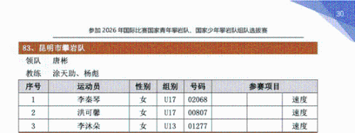 本次选拔赛由国家体育总局登山运动管理中心、中国登山协会主办,是国内青少年攀岩领域最高规格的选拔赛事,汇聚全国顶尖攀岩少年,争夺入选国家青年队、少年队的宝贵资格。根据竞赛规程,洪可馨将征战U17组女子速度赛,李沐朵将参与U13组女子速度赛,两名小将均来自官渡区,是我区青少年攀岩运动培养的优秀代表。
